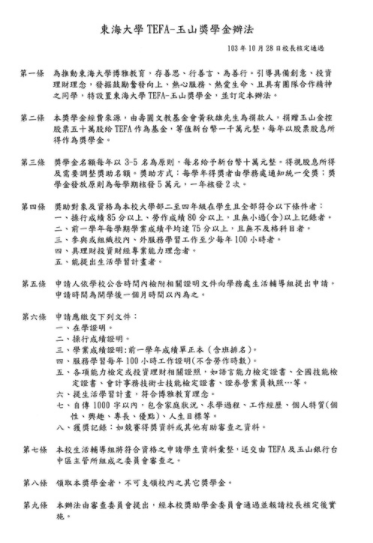 105學年度上學期東海大學TEFA玉山獎學金,申....
